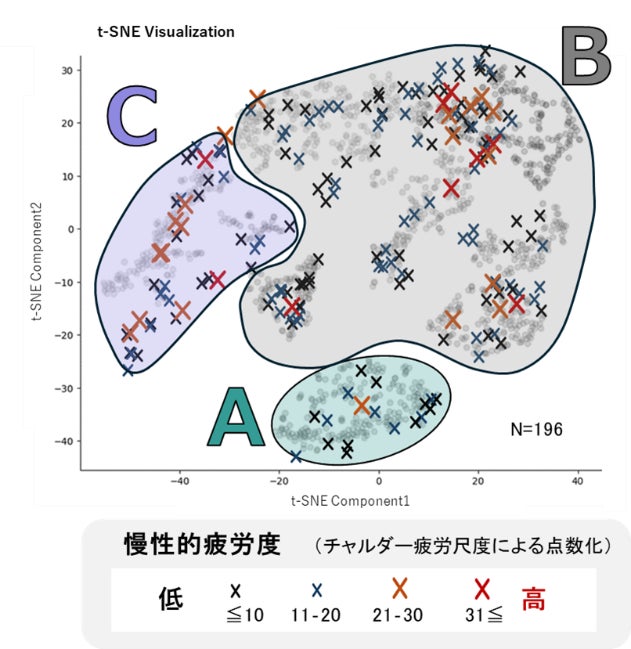 2024年に実施した歩行測定によって196名をA~Cタイプのいずれかに分類し、チャルダー疲労尺度で評価した慢性的疲労度のスコアと併せて図1に重ねてプロットしました*5(図2)。