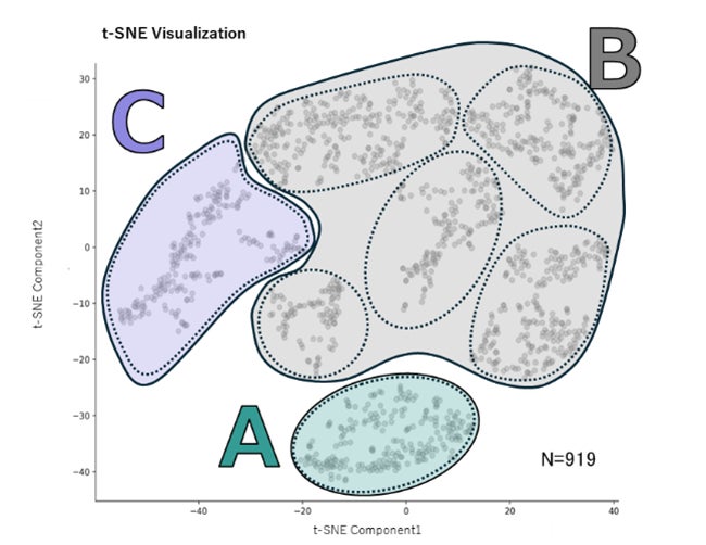 Walk Coordinator技術を搭載したアプリを使うと、わずか8歩の歩行から骨盤角度・関節角度・関節モーメントの左右差や可動性などを測定できます。このアプリを用いて、2023年に919人のデータを取得し*3、歩行時の身体アライメントの非対称性に関する52項目を機械学習で整理。身体アライメントのゆがみの程度で分類したマップを作成しました*4。このマップは、52項目から計算された一人ひとりの身体アライメントのゆがみ特徴に基づいてプロットしており、位置関係が近いほど特徴が似ていることを示しています(図1)。