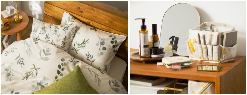 自然モチーフの柄を取り入れて、春の息吹を感じられるベッドルームに。
