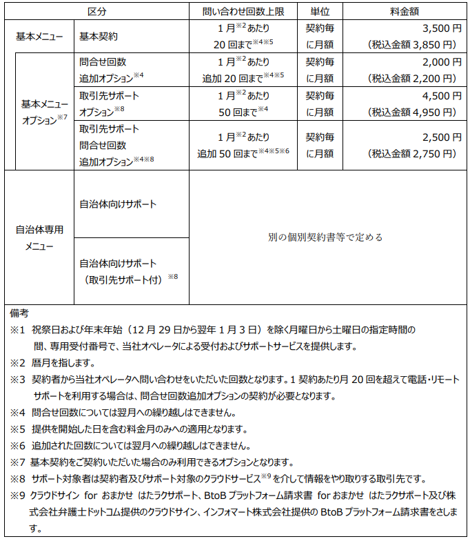 今回新たにリリースするメニューは「基本メニュー向けオプション」の取引先サポートオプション、取引先サポート問い合わせ回数追加オプションと「自治体専用メニュー」です。