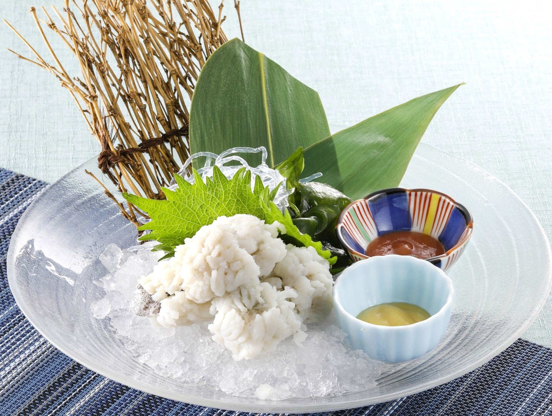 この時期旬をむかえる『鱧』は産卵期をひかえ脂がのって身が締まり、実に美味しくなります。「梅雨の雨をのんで旨くなる」といわれる味覚を、からし酢味噌と梅肉でお召し上がりいただきます。