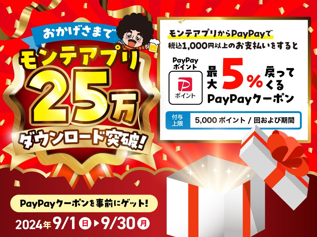 <祝 25万ダウンロード‼>モンテアプリから“PayPay”決済で『ポイント5%付与』キャンペーン開催中!