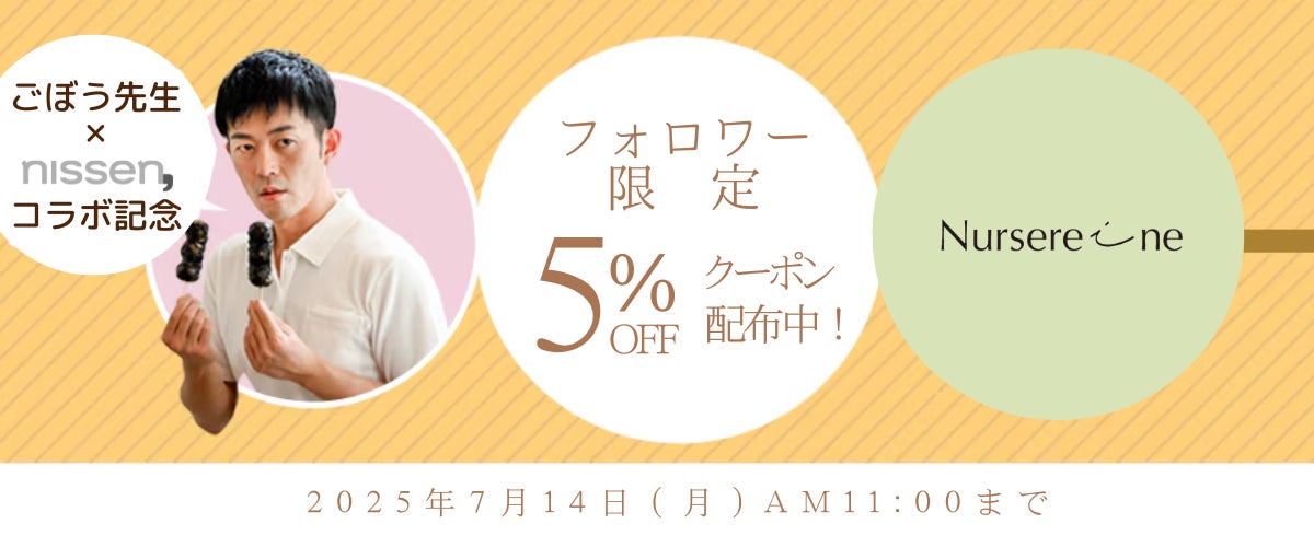 このたび「ごぼう先生」とのコラボレーション企画を記念して、対象商品が5%OFFになるクーポンを動画視聴者に配布いたします。なお、このお得なキャンペーンは、2025年7月14日(月)AM11:00まで。ぜひこの機会に、「ナースレーヌ」商品をお試しください。