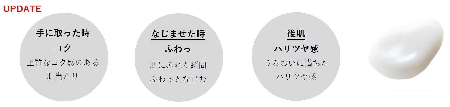通年の美白ケアに寄り添うここちよさが人気のテクスチャーが、三段階に変化しさらにパワーアップ。美容成分※19が凝縮された濃密な「コク」のある美容液が「ふわっ」と一体化。まるで顔全体に上品な光のヴェールを纏っているかのような光を拡散しうるおいに満ちた「ハリツヤ感」に包まれた後肌を感じられます。毎日の美白ケアを楽しくさせる使いごこちを叶えました。