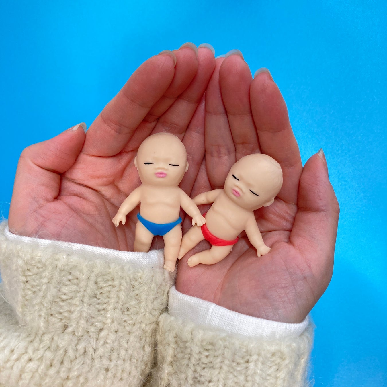 「ベイビースクイーズ」はスクイーズ素材の赤ちゃん人形で、リアルな赤ちゃんフェイスと引っ張ると”びよ~ん”と伸びる感触がクセになると、昨年TikTokから人気が爆発しました。