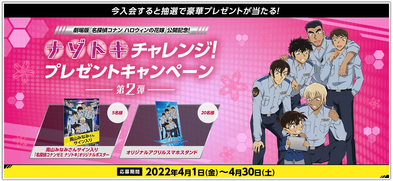 名探偵コナンゼミ有限責任事業組合は2022年4月15日(金)公開予定の劇場版「名探偵コナン ハロウィンの花嫁」の公開を記念して、オリジナルグッズなどがあたる「ナゾトキチャレンジ!プレゼントキャンペーン」第2弾を開催します。また「名探偵コナンゼミ ナゾトキ」が4月1日より大幅リニューアルし、描き下ろしイラストやボイスなどここでしか手に入らないオリジナルコンテンツが充実し、『名探偵コナン』の世界観をよりお楽しみいただけるサービスにパワーアップしたことをお知らせいたします。