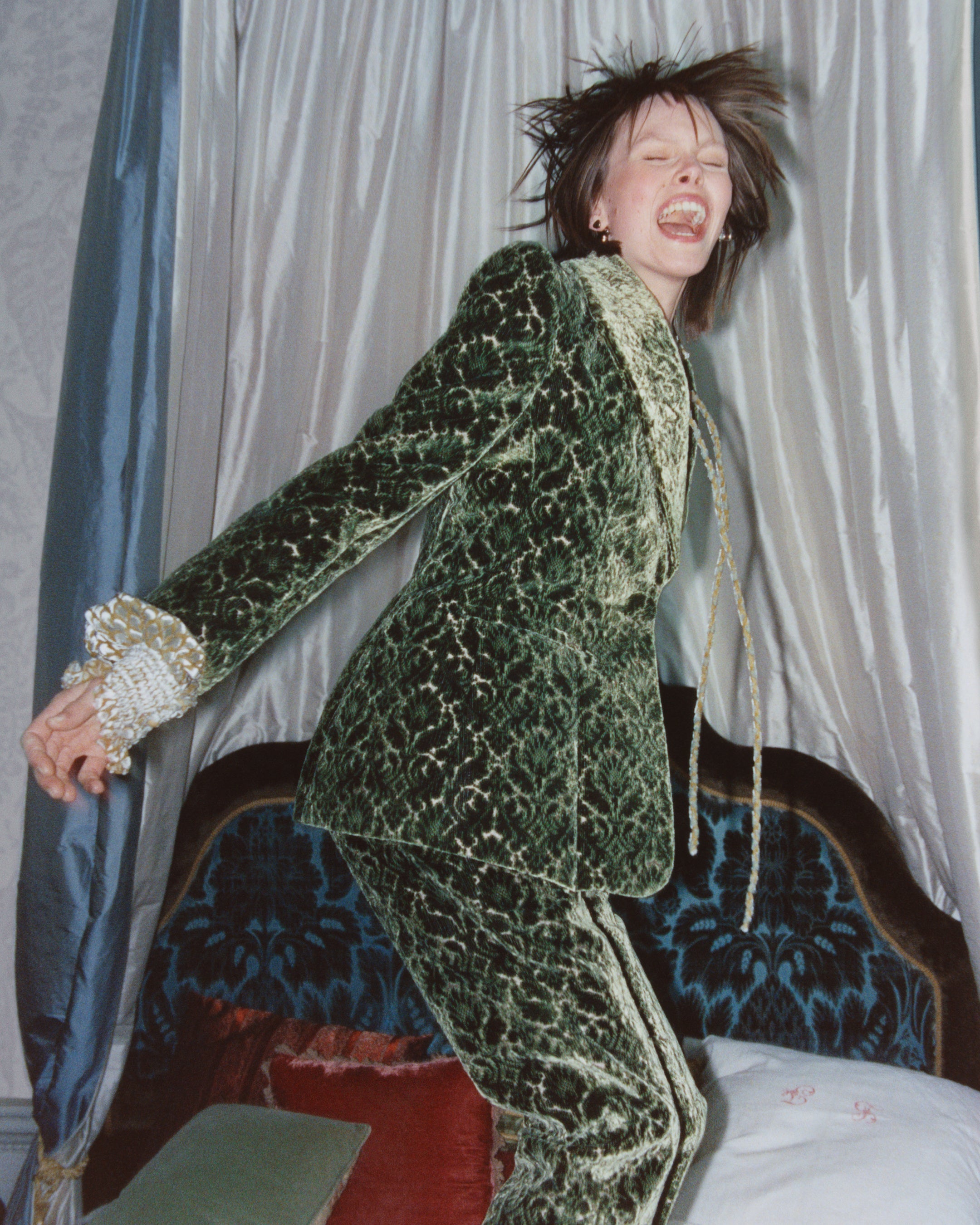■ウィリアム・モリスのデザインを想起させるベルベットブロケードは、乗馬スタイルに着想を得たコートやスーツに仕立てられました。