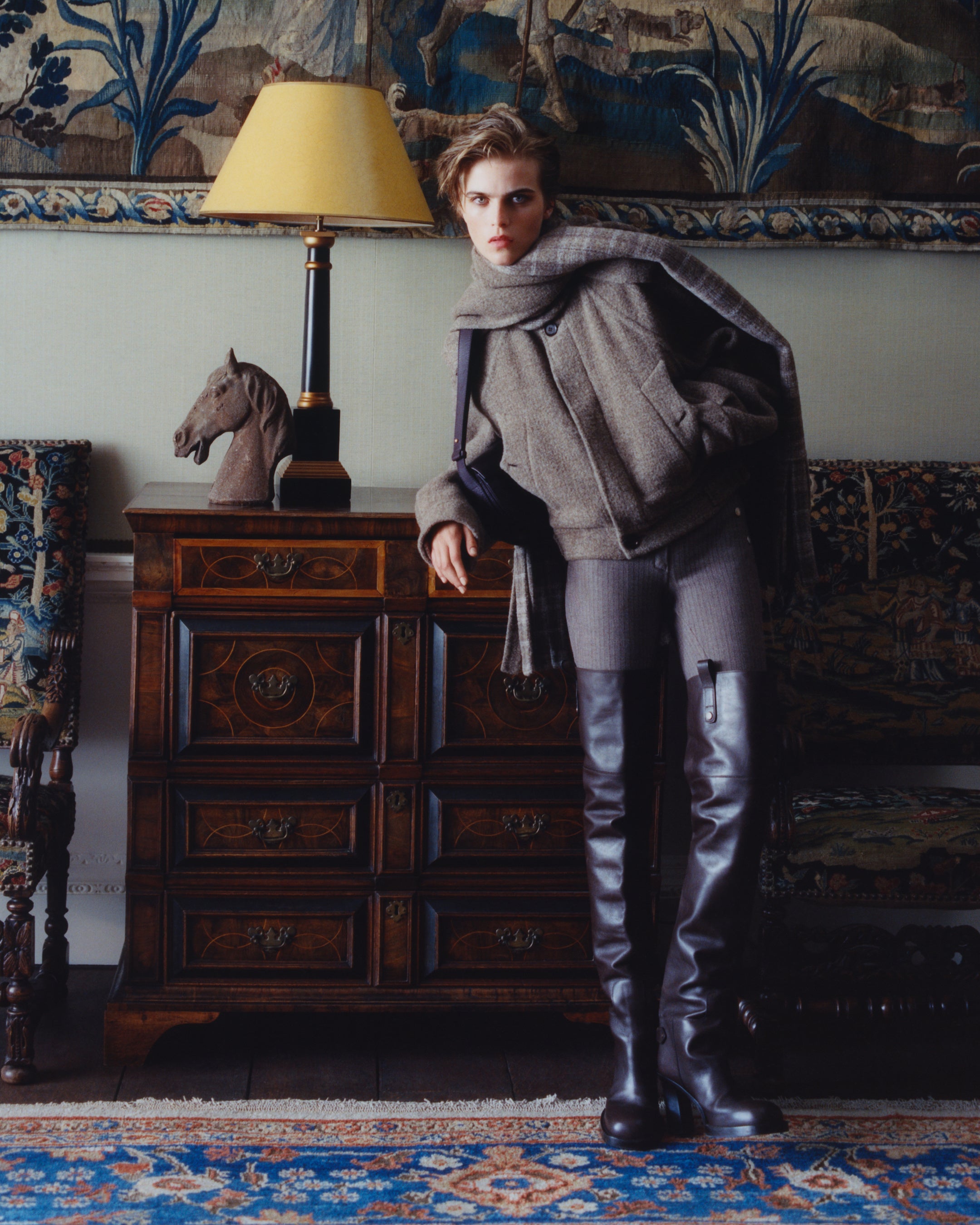■クロスステッチのニットは歴史的なタペストリーを引用。カラーは「タペストリーブラウン」「ディアトープ」「パンキッシュレッド」「メイズグリーン」など豊かなパレットで展開されています。タータン風のウールチェックと、インターシャレザーに織り込まれたバーバリーチェックが共にコレクションを彩ります。 n nサヴィル・ロウのテーラリングとカントリー風スタイルを融合し、ウールやコーデュロイのスーツにジョッパーズやプリーツ入りチェックキルトをコーディネート。ロールネック、リブニット、ジョガーは起毛ウールでどこか温かみを感じさせる仕上がりに。