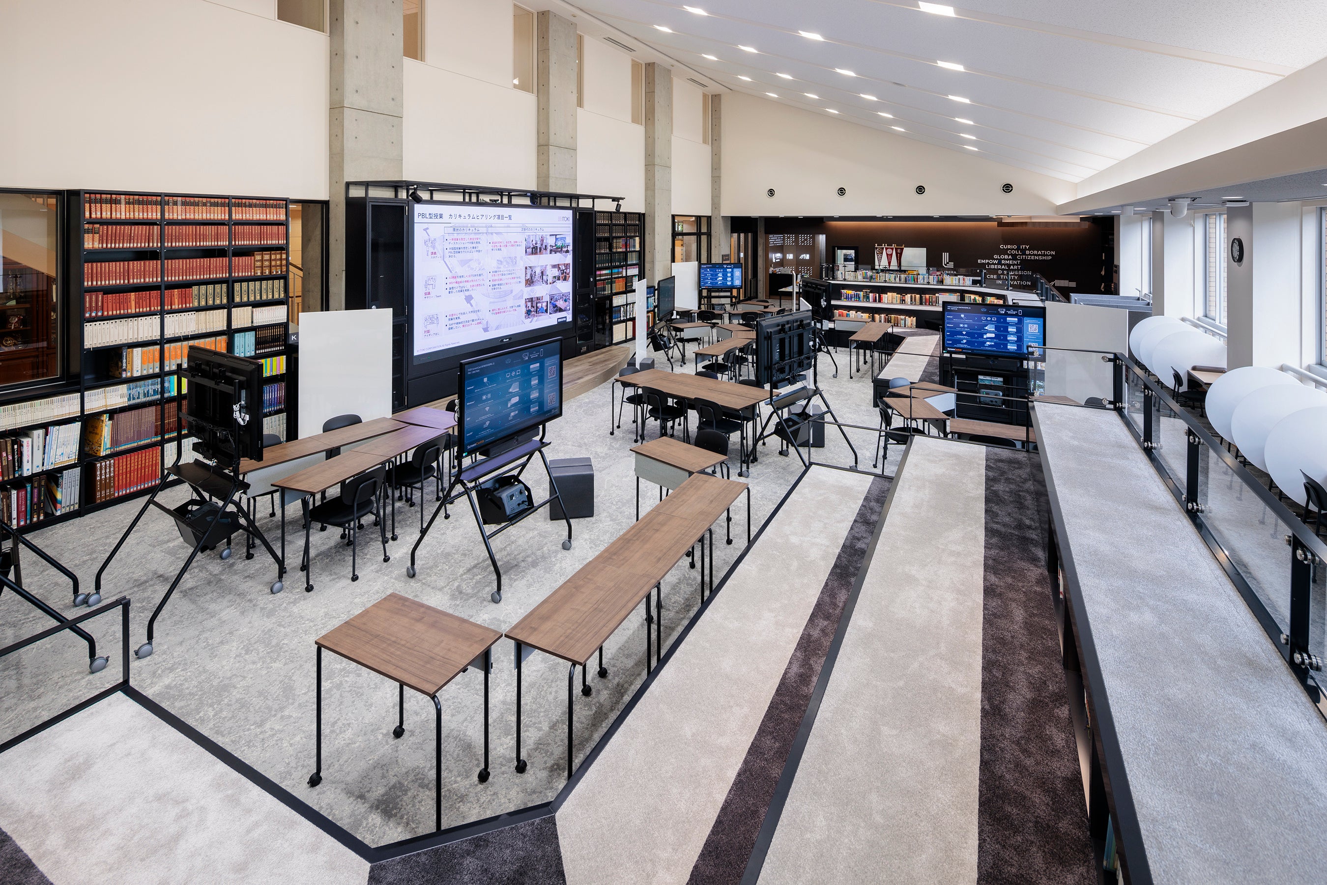 続いて視察した図書館(左写真)は、昨年リニューアルされ、大型電子黒板を備えたPBL(Problem Based Learning:課題解決型学習)型授業の拠点となっています。150人規模の授業が可能で、プレゼンテーションの様子は校内モニター全体に配信する仕組みも整っており、視察団からはその充実した設備について熱心な質問が寄せられました。