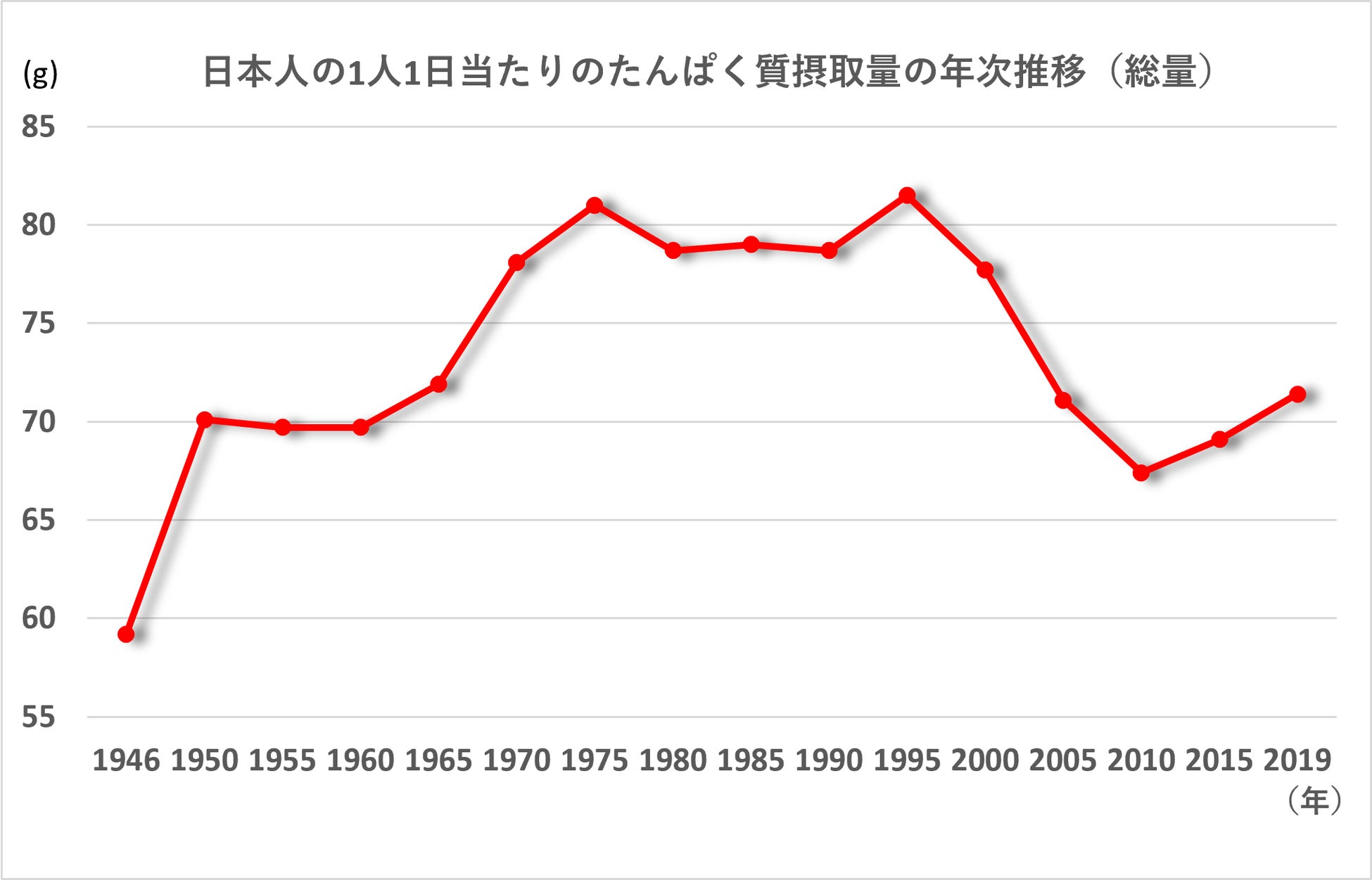 近年、日本人のたんぱく質の摂取量は過度のダイエットや偏食傾向の影響で、激減しています。1日あたりのタンパク質摂取量でみると、戦後(1950年)と同水準まで落ち込んでいます。※1