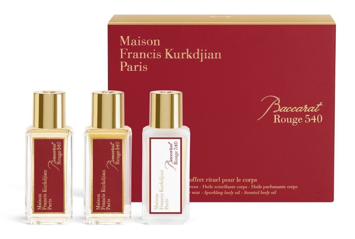 人気の「バカラ ルージュ540」の香りを全身で楽しめるセット。ヘアミスト、スパークリング ボディオイル、ボディオイルのスモールサイズ(35mL)をホリデーシーズンらしく、この香りを象徴する鮮やかなレッドカラーのボックスにセット。