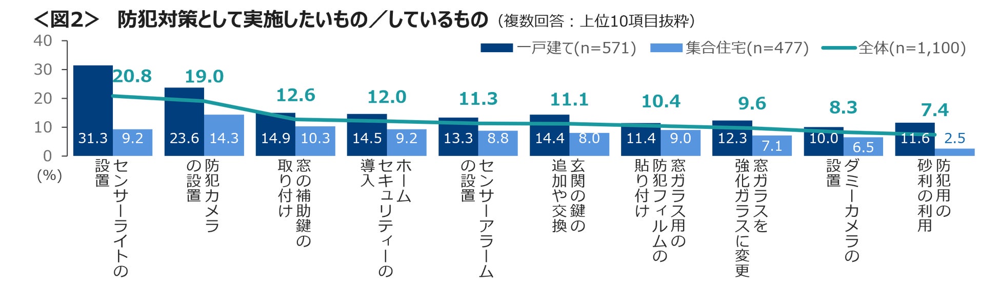 住宅別でみると、一戸建ては「センサーライトの設置」が31.3%で最も高く、「防犯カメラの設置」が23.6%で続く。集合住宅では「防犯カメラの設置」が1位だが1割台で、一戸建てよりも防犯対策への意識は低い。 <図2>