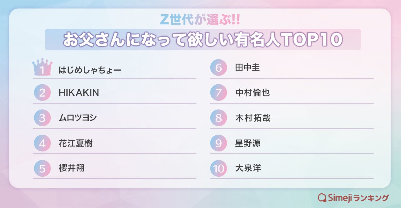 【Simejiランキング】Z世代が選ぶ!!「お父さんになって欲しい有名人TOP10」