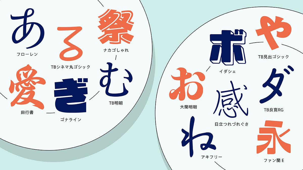 新たにMorisawa Fontsへ搭載するタイプバンクフォントは、70ファミリーです。 明るくおおらかなイメージでデザインされたかなとスッキリと整理されたエレメントを持つ漢字で構成された「TB明朝」、これまでMorisawa Fontsではお取り扱いのなかった「TBカリグラゴシック」のE、Uのウエイトをはじめ、「TBデジタル丸ゴシック」の漢字にレトロなあたたかみを演出するシネマ仮名を組み合わせた「TBシネマ丸ゴシック」、毛筆の自由な動きを原点として趣のある表情の「フローレン」、軽やかなペン字風の「日立つれづれぐさ」などが加わり、デザインの幅を広げます。