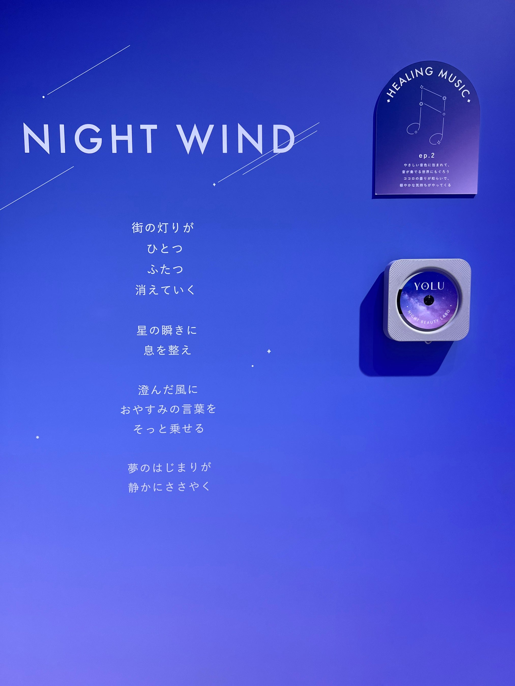 音楽プレイヤーからは、今回のイベントオリジナルで制作した、心地よい眠りに誘うYOLUオリジナルのヒーリングミュージックを体験いただきました。ヒーリングミュージックは、YOLU公式You Tubeにて公開中です。