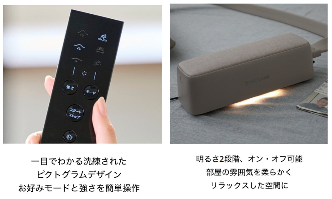 同色の付属のポンプユニットにはフットライト機能を搭載し、リラックス空間を演出します。また、リモコンも暗い空間でも直感的に操作できるよう、ピクトグラムを採用するなど、寝室空間にマッチしたデザインでまとめました。