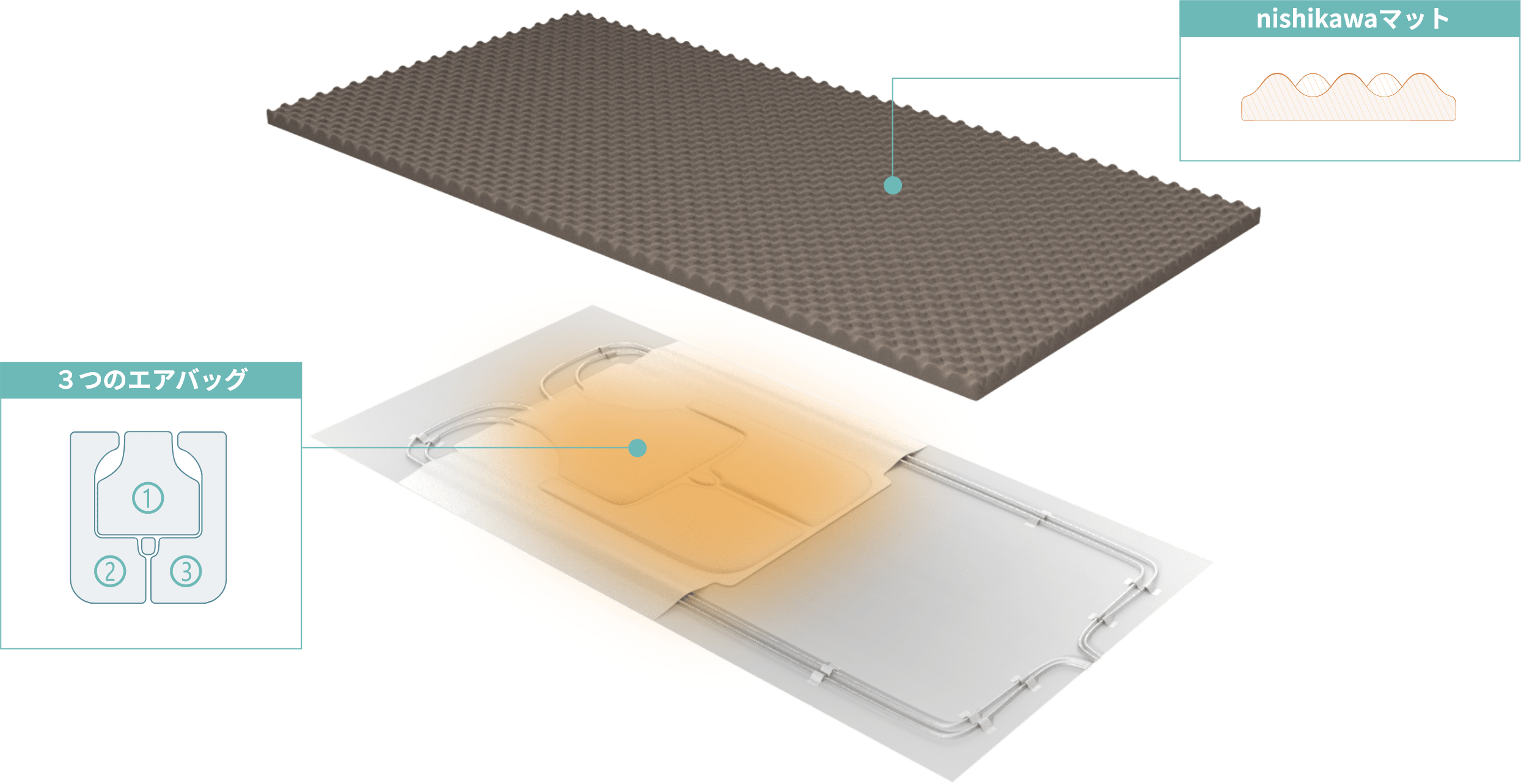 より良い眠りを得るために、ボディメンテナンスの専門ブランド「ドクターエア」と、長年の歴史を持つ寝具メーカー「nishikawa」が手を組み、就寝中の《理想の寝姿勢》に着目。「ドクターエア」独自のエアバッグによるストレッチ体感ができる機能と、体圧分散で睡眠中の身体の負担を軽減する「nishikawa」の高機能マットの融合によって、これまでにない睡眠環境のサポートに特化した新しいソリューション製品【3Dエアストレッチマット リッチスリープ】を実現。