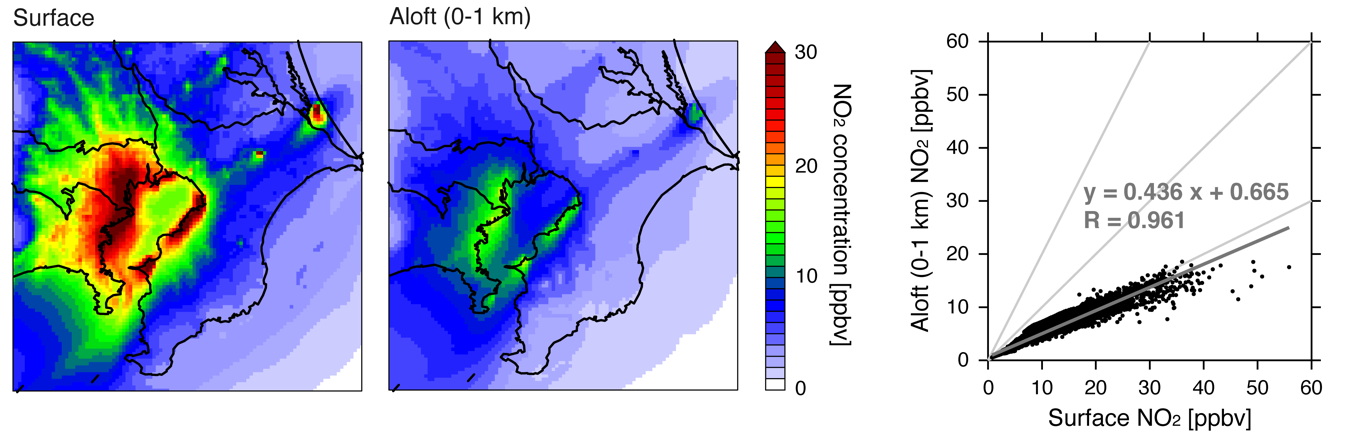 本研究により、大気環境モデルは集中観測期間中の地上と上層(高度0-1 km)のNO2濃度の空間分布や時間変化をよく再現できることが分かりました。また、地上と上層の濃度の対応関係を見てみると、両者は強い相関関係をもっており、上層の濃度は地上の濃度の0.4-0.5倍に相当することなどが新たに分かりました。