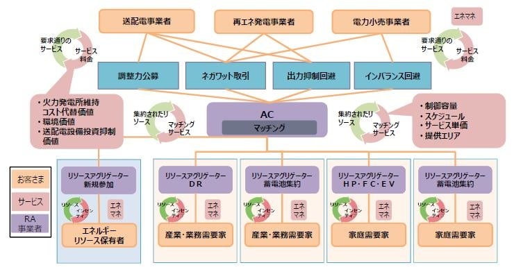 需要家とVPPサービス契約を締結してリソース制御を行う事業者(リソースアグリゲーター)が制御した電力量を複数束ね、一般送配電事業者や小売電気事業者と直接電力取引を行う事業者