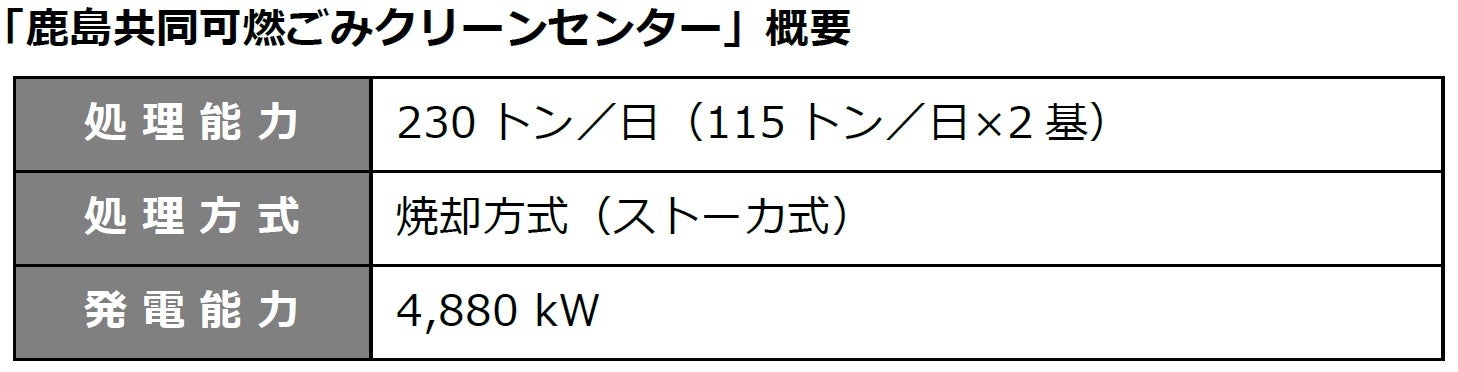 同センターは、これまで鹿嶋市と神栖市にそれぞれ設置されていた可燃廃棄物処理施設の老朽化に伴う統廃合により新設されたものです。処理能力115トン/日のストーカ式焼却炉※2基および発電設備を備えるエネルギー回収型廃棄物処理施設で、同センターの稼働により、2市の可燃廃棄物を一元的に焼却処理してエネルギー回収を行うことが可能となります。