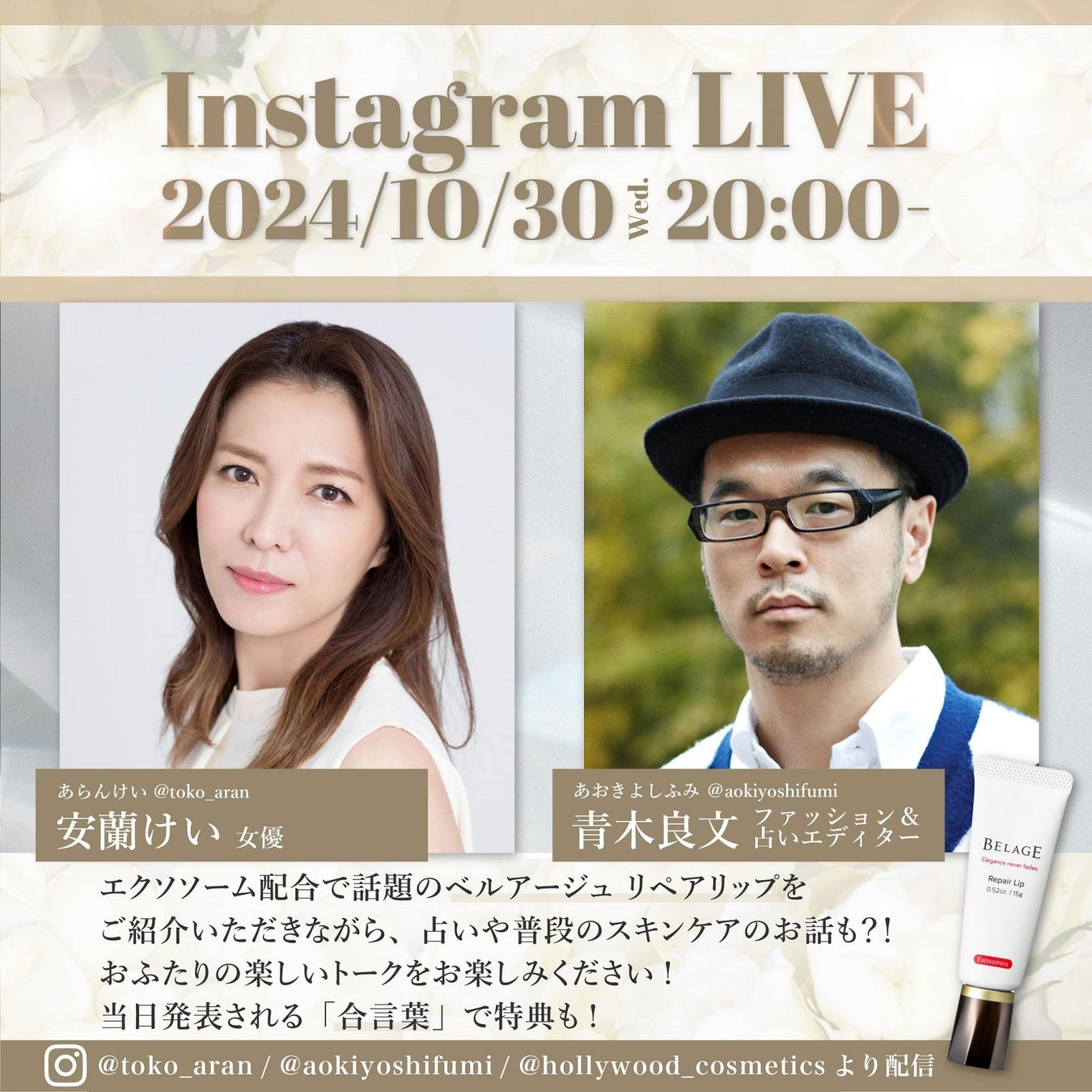 10月30日(水)安蘭けいさん×青木良文さん‟リップケア”について語る インスタライブ presented by ハリウッド!エクソソーム配合の唇美容液『ベルアージュ リペアリップ ∞』好評企画!