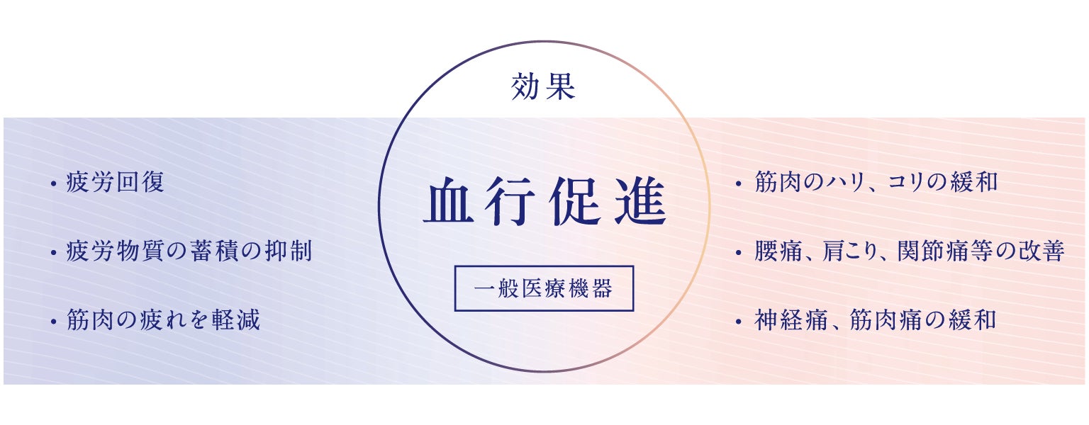 MTG独自の特殊繊維「Mediculation®(メディキュレーション)」を使用しており、一般医療機器区分「家庭用遠赤外線血行促進用衣」として、「血行促進」「疲労回復」「疲労物質の蓄積の抑制」「筋肉の疲れを軽減」「筋肉のハリ、コリの緩和」「腰痛・肩こり・関節痛等の改善」「神経痛・筋肉痛の緩和」の7つの効果が期待できます。
