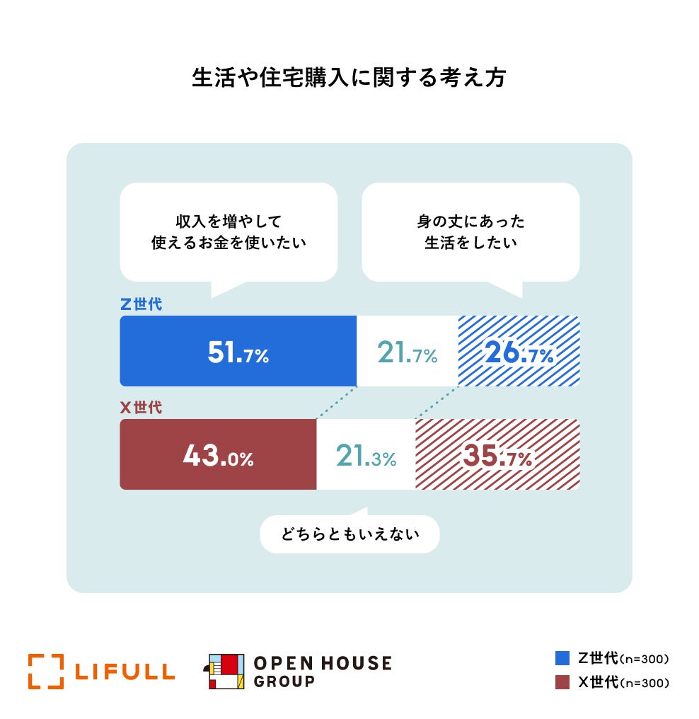 お金に関する質問では、「収入を増やして使えるお金を使いたい」か「身の丈に合った生活をしたい」かを聞いたところ、Z世代は51.7%と半数以上が「収入を増やして使えるお金を増やしたい」と回答し、X世代(43.0%)を上回りました。