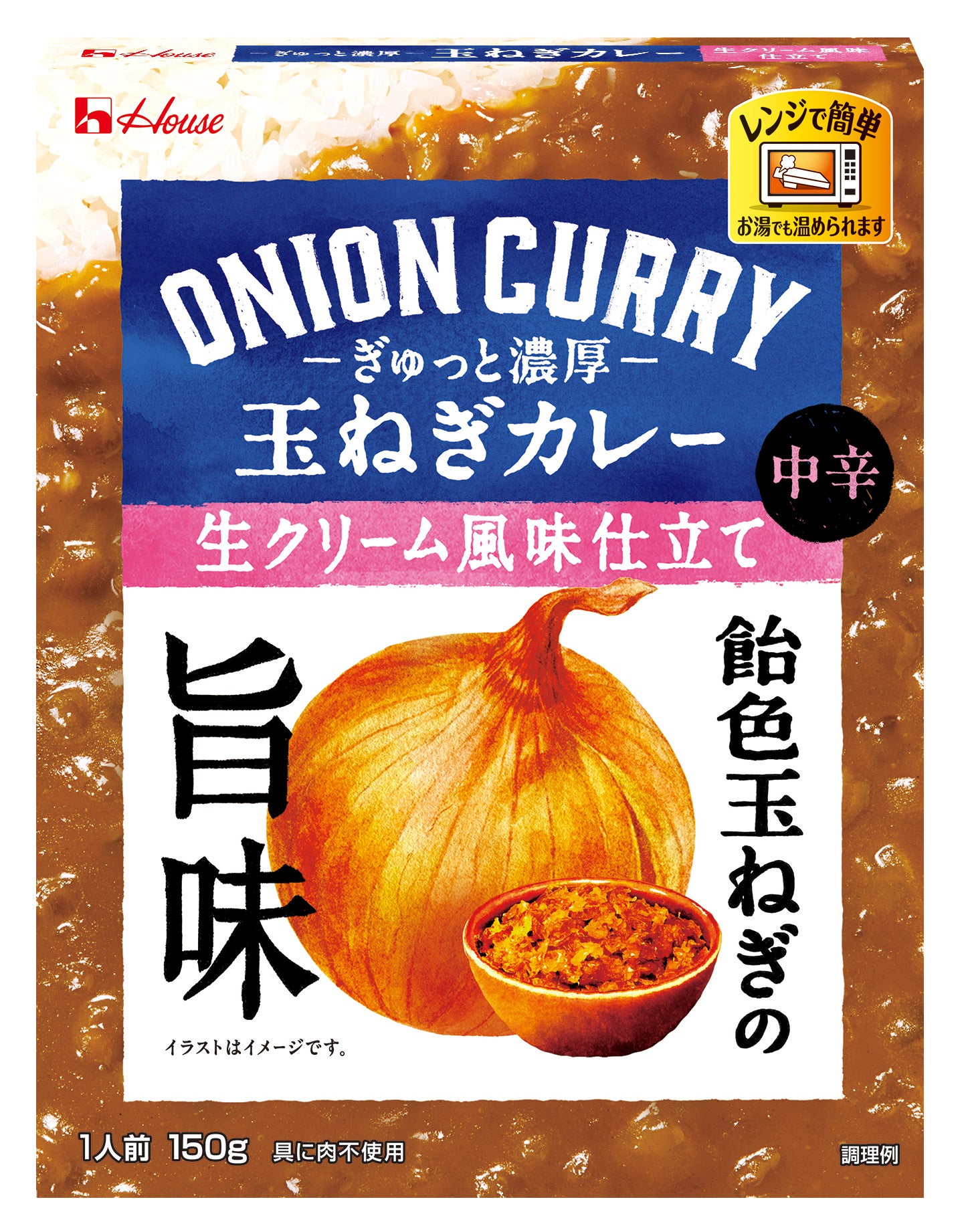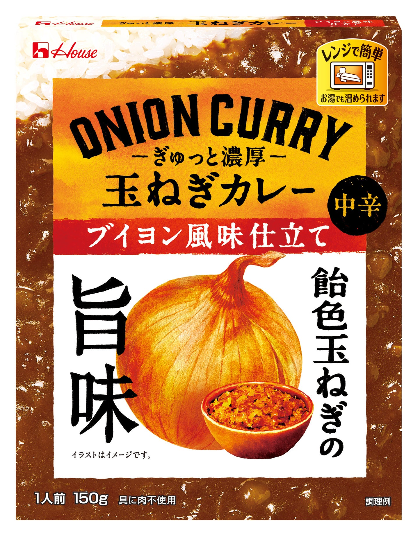 玉ねぎを主役に、その旨味や特徴をふんだんに活かした新たなコンセプトのカレーを、レンジで箱ごと加熱するだけで手軽に楽しめます。内容量150g、オープン価格(税別参考小売価格238円)。