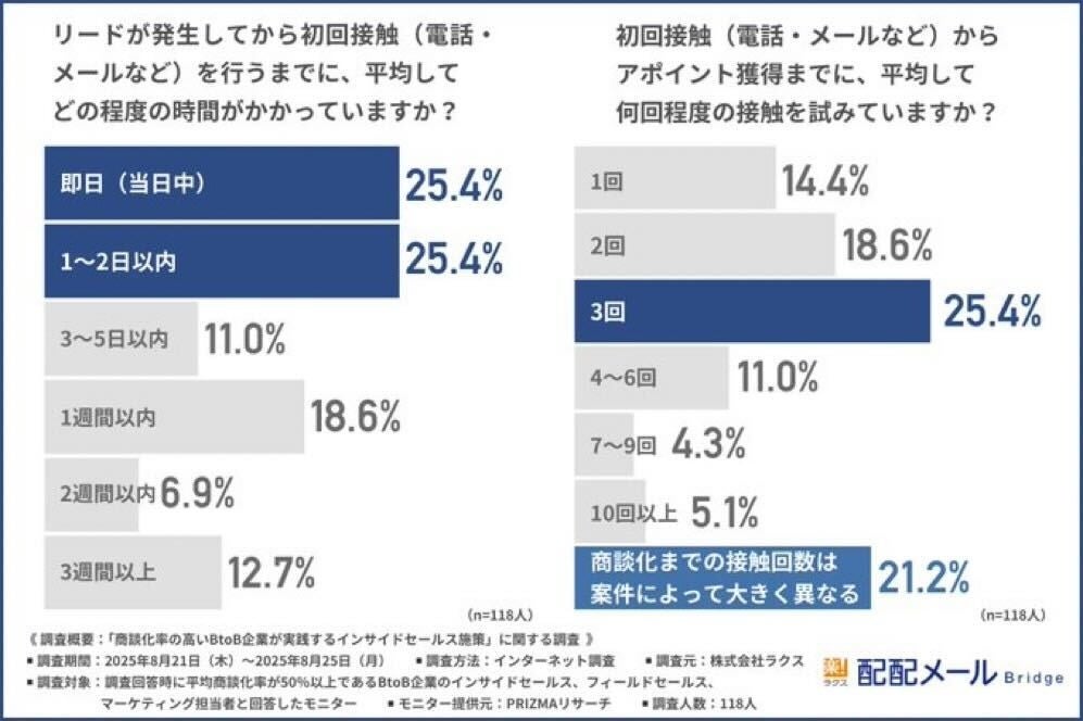 株式会社ラクス様の調査では、初回接触からアポイント獲得までに、3回ほど接触することが多いというデータも実際に出ております。