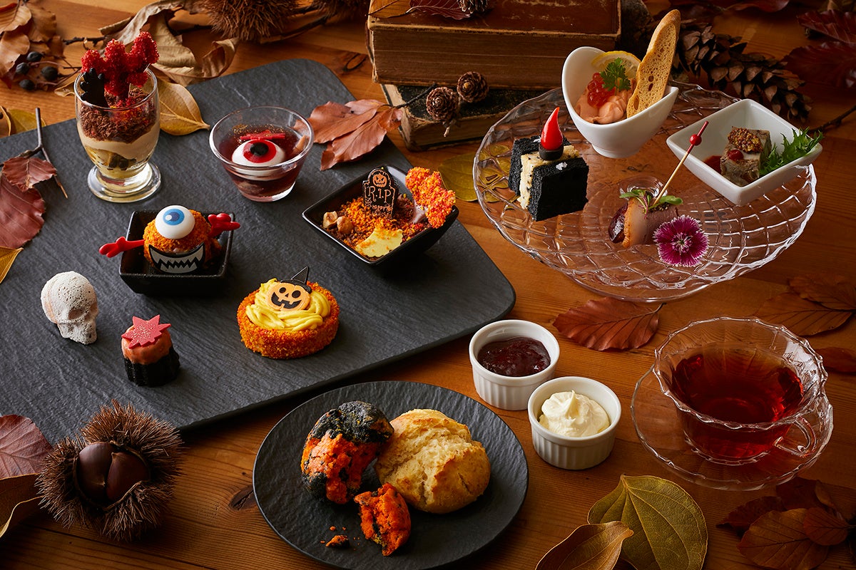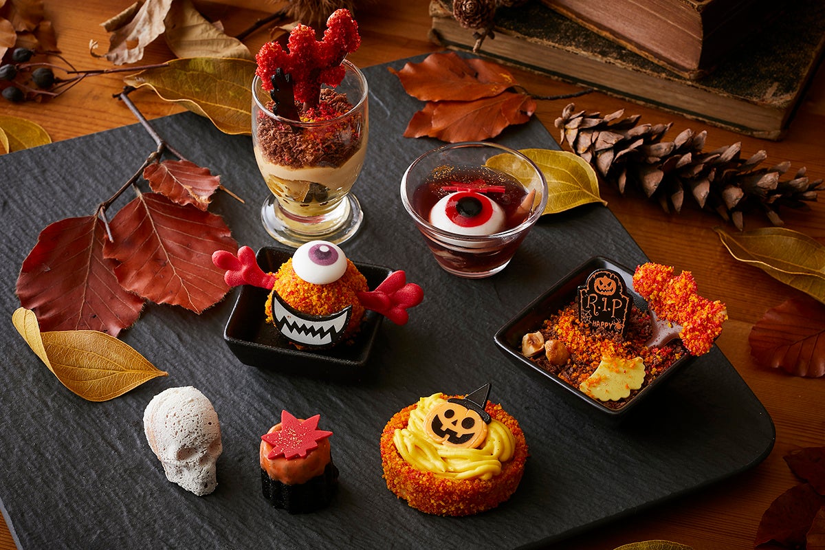 モンスターが紅葉を観にやってきた様子をイメージしたスイーツは7種類。キャラメリゼした洋梨とクリームが層をなす、紅葉に染まる秋の森を思わせるトライフルからはチョコレートの手がひょっこりと顔を出し、香ばしいナッツがアクセントのかぼちゃプリンは墓地をモチーフに。ほっくりとした甘さの「スイートポテトタルトとかぼちゃのクリーム」には愛らしいかぼちゃお化けの表情を添えて、艶やかに煌めく「無花果のコンポートジュレ」には、目玉のマシュマロが浮かび怪しげな雰囲気を演出。モンスターの姿をした「チョコレートチーズケーキ」やドクロをかたどったマドレーヌなど、ハロウィン気分を盛り上げる秋のスイーツがスタンドをにぎやかに彩ります。