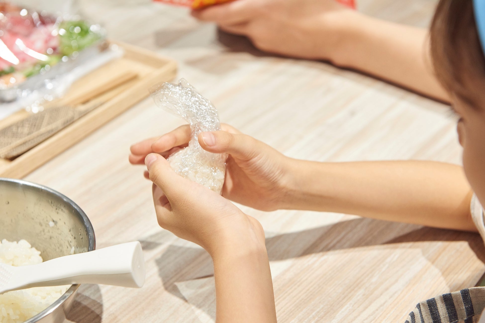 おうちでのお寿司としては、従来から定番の手巻き寿司に加え、ケーキ寿司やワイングラス寿司、飾り巻き寿司など、多彩でカジュアルな寿司スタイルが広がっています。今回の体験会では、お子様と一緒に作りやすいよう、「カンタン酢」を使ってすし飯を作り、ラップで作る手まり寿司の体験をしていただきました。