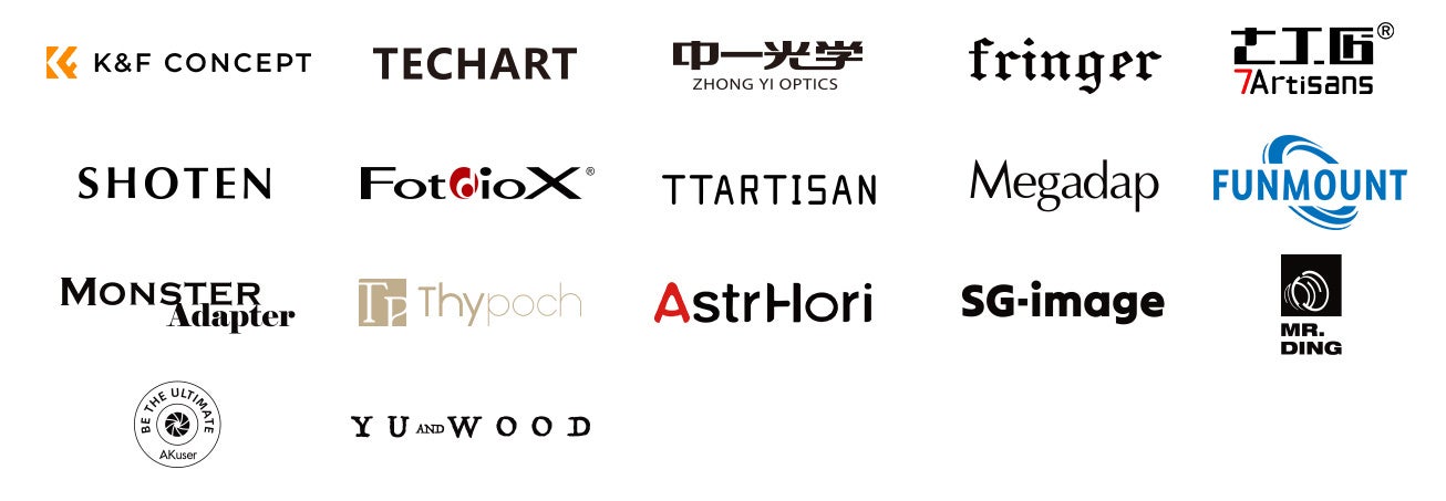 TTArtisan / 7Artisans / 中一光学 / Thypoch / K&F Concept / MonsterAdapter / Megadap / FUNMOUNT / Fringer / SHOTEN / TECHART / Fotodiox / AstrHori / SG-image / MR.DING / AKUSER / YUWOOD