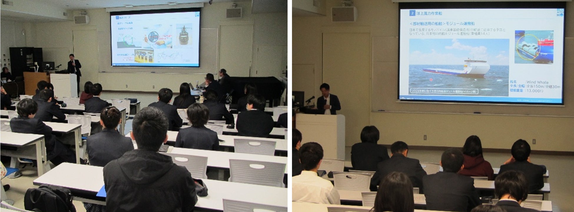 当日は、商船三井マリテックス株式会社、株式会社商船三井、株式会社北拓より、洋上風力発電事業に携わる4 名の専門講師をお招きしました。講義では、洋上風力発電の基礎から、建設前の立地環境調査、建設資材や部品の海上輸送、さらにメンテナンスを含む運用段階に至るまで、洋上風力発電事業の一連の流れを実際の現場経験をもとに分かりやすく解説いただきました。学生たちは、実際の海上プロジェクトの流れを具体的に学ぶことができ、将来のキャリア形成にもつながる貴重な機会となりました。