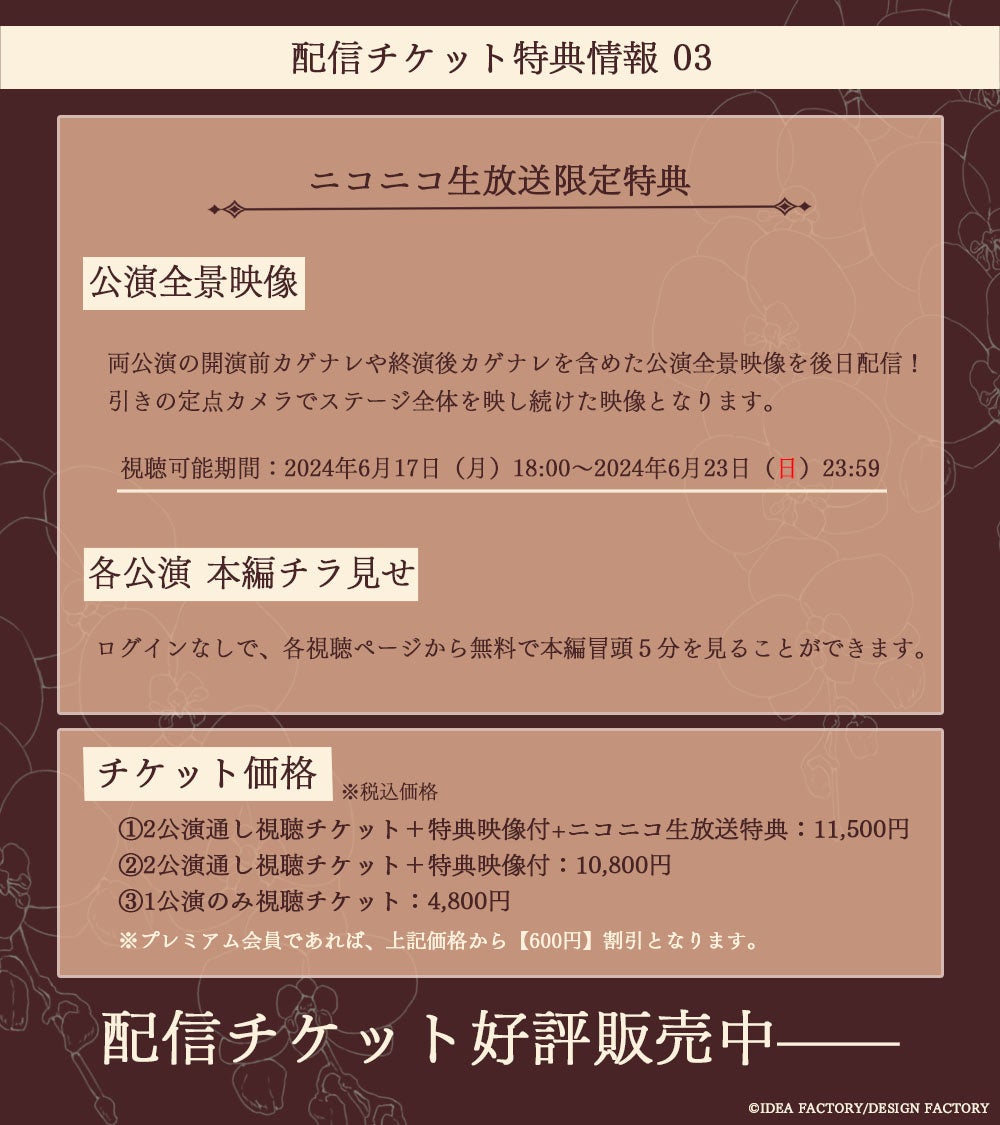 2公演通し配信チケット+特典映像付+ニコニコ生放送限定特典付:11,500円(税込)