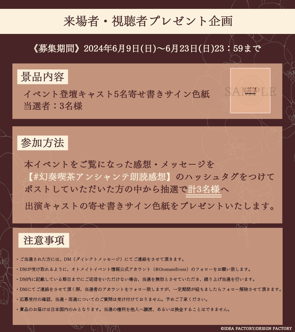 本イベントをご覧になった感想・メッセージを【#幻奏喫茶アンシャンテ朗読感想】のハッシュタグをつけてポストしていただいた方の中から抽選で計3名様へイベント登壇キャストの寄せ書きサイン色紙をプレゼントいたします。