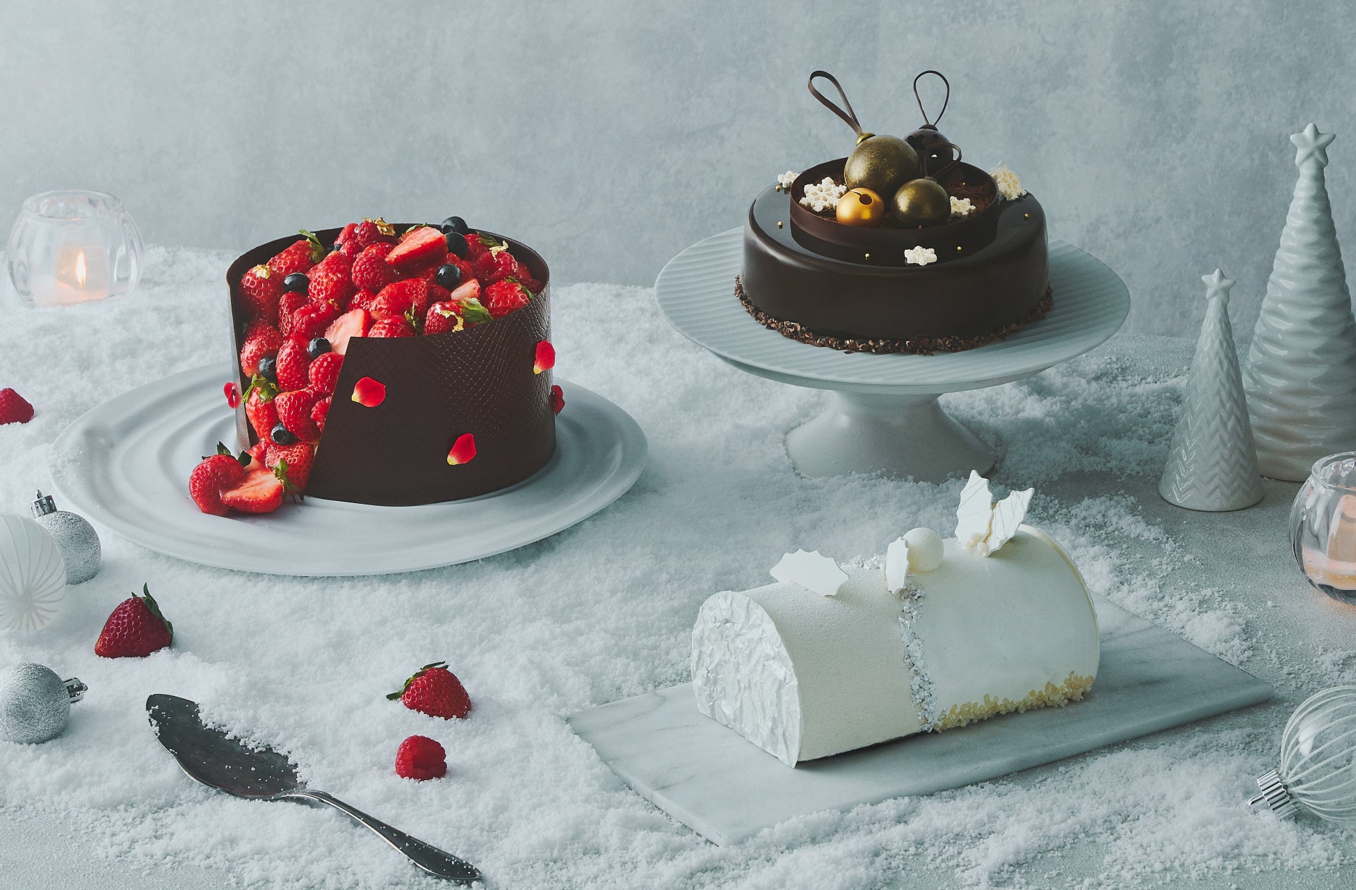 “零(こぼ)れる宝石”をイメージしたいちごのケーキや、オーナメントモチーフが輝くチョコレートケーキなど3種