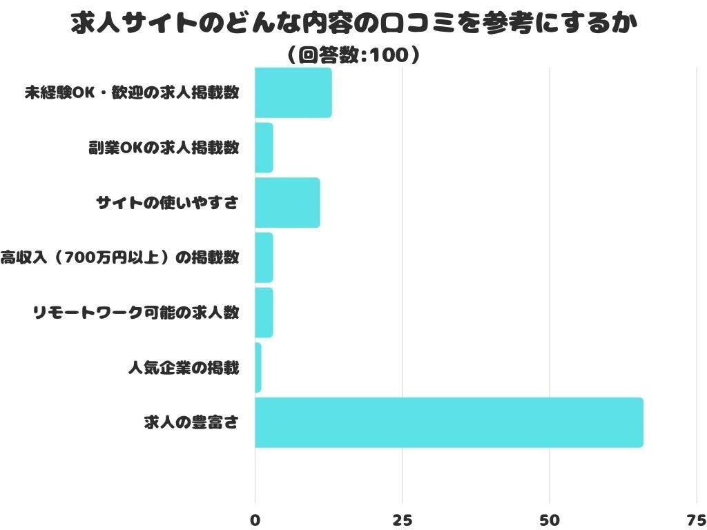 求人サイトのどんな内容の口コミを参考にするかをアンケートにて調査したところ、1位は「求人の豊富さ」でした。