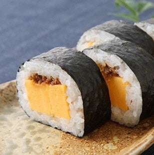 お出汁の染みたふわふわ玉子と丹後伝統の鯖そぼろでハーフサイズの巻寿司に仕上げました。