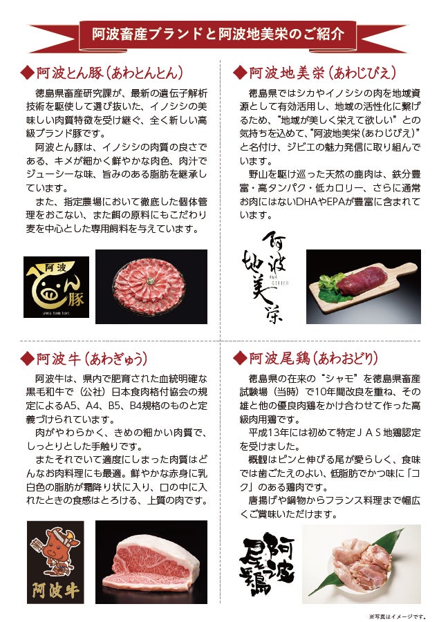 徳島が誇る「阿波畜産ブランド」(阿波牛、阿波とん豚、阿波尾鶏)と、徳島のジビエブランド「阿波地美栄(県産鹿肉)」を同時に味わうことができる、またとない機会です。