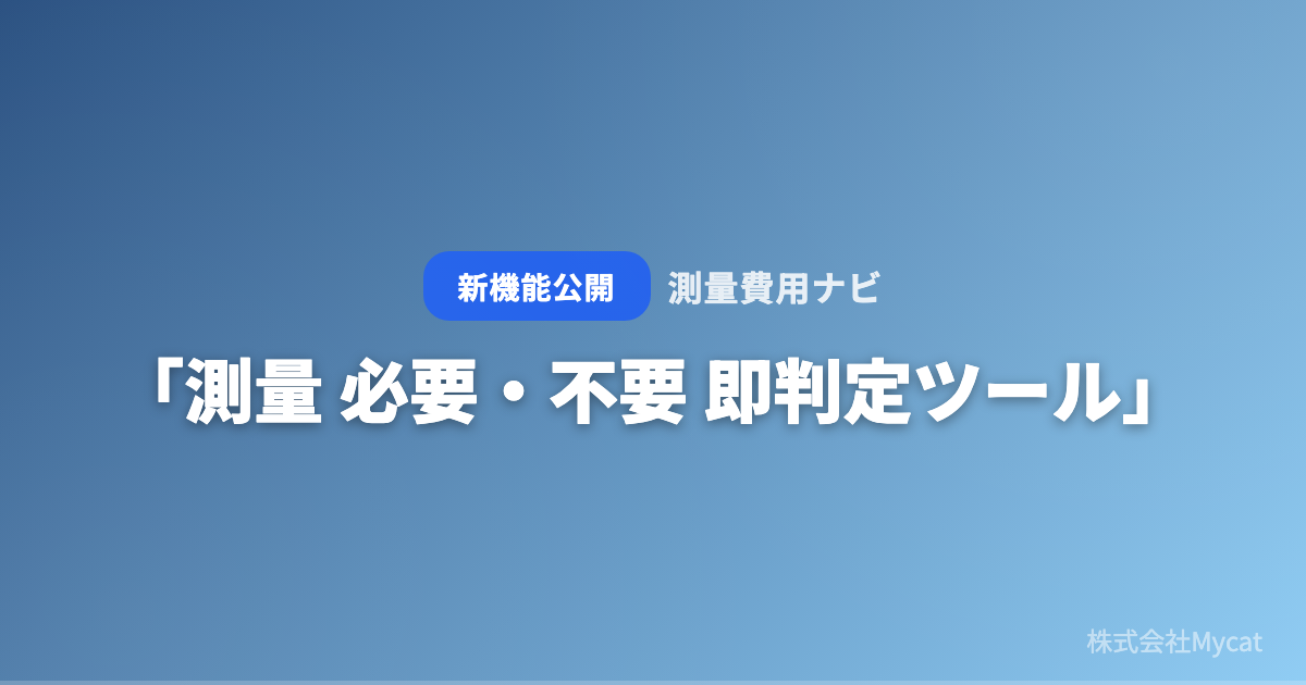 株式会社Mycat(本社:東京都目黒区)は、AI確定測量費用シミュレーター「測量費用ナビ」(https://sokuryo.xyz)において、測量 必要・不要 即判定ツール(https://sokuryo.xyz/tools/need-checker)を新たに公開しました。
