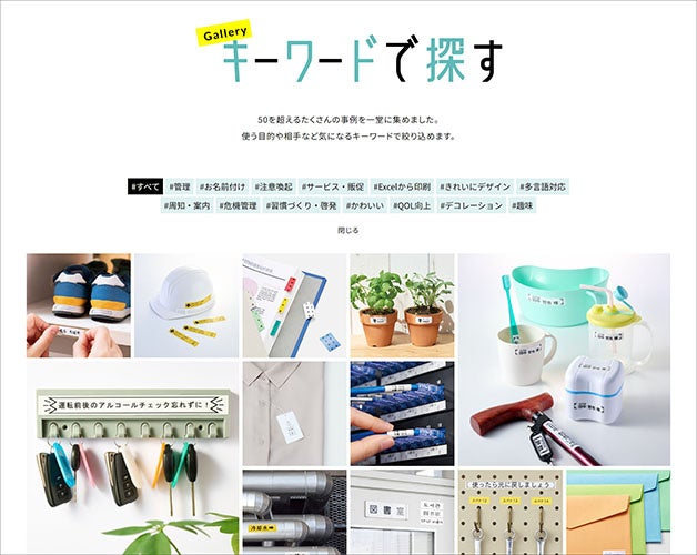 お名前付け、注意喚起、多言語対応など、キーワードを選ぶだけで直感的に活用術を探せます。また、ギャラリーのように画像を一覧できるため、新たな活用術を発見でき「テプラ」を余すことなく使いこなせます。
