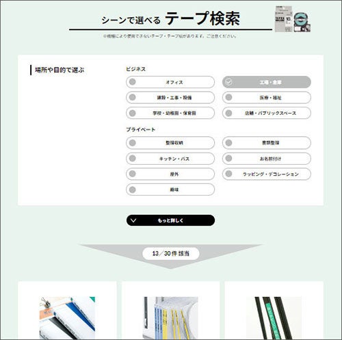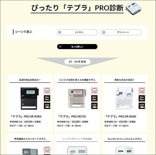 『ぴったり「テプラ」PRO診断』では使用シーンややりたいことを選択するだけで自分に合った機種を見つけることができます。また、『シーンで選べるテープ検索』では、業界最多の豊富なテープの中から、場所や目的に合ったテープを絞り込むことが可能です。