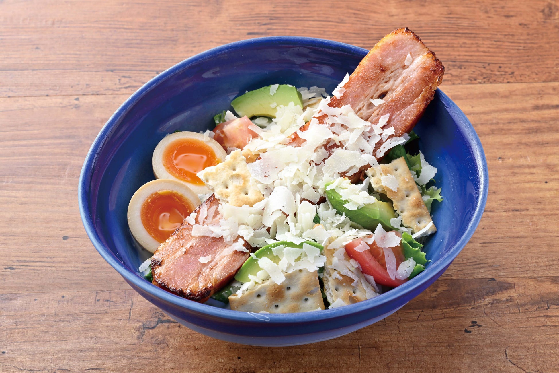 豪快に盛り付けた厚切りベーコンと、薄削りにした北海道パルメザンチーズなどを使用したプレミアムなサラダです!