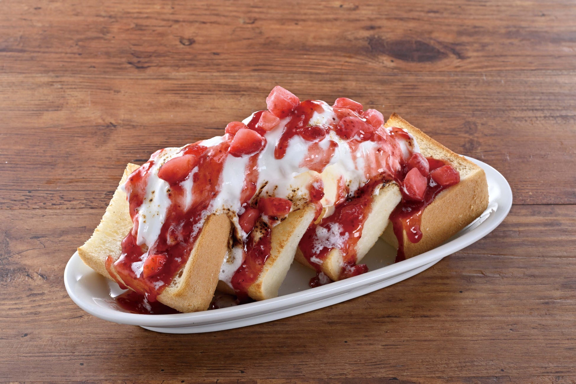 サックリ焼き上げたパンの上にバニラアイスとストロベリーソース、クラッシュ苺をたっぷり乗せた、見た目も華やかな新作デザートです!