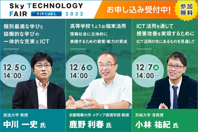Sky株式会社では、現在開催中のオンラインイベント「Sky Technology Fair Virtual 2022」にて、スペシャルウィーク企画「教育×ICT ~ICTが導く教育の未来」として専門家による各種講演を12月5日より順次ライブ配信いたします。