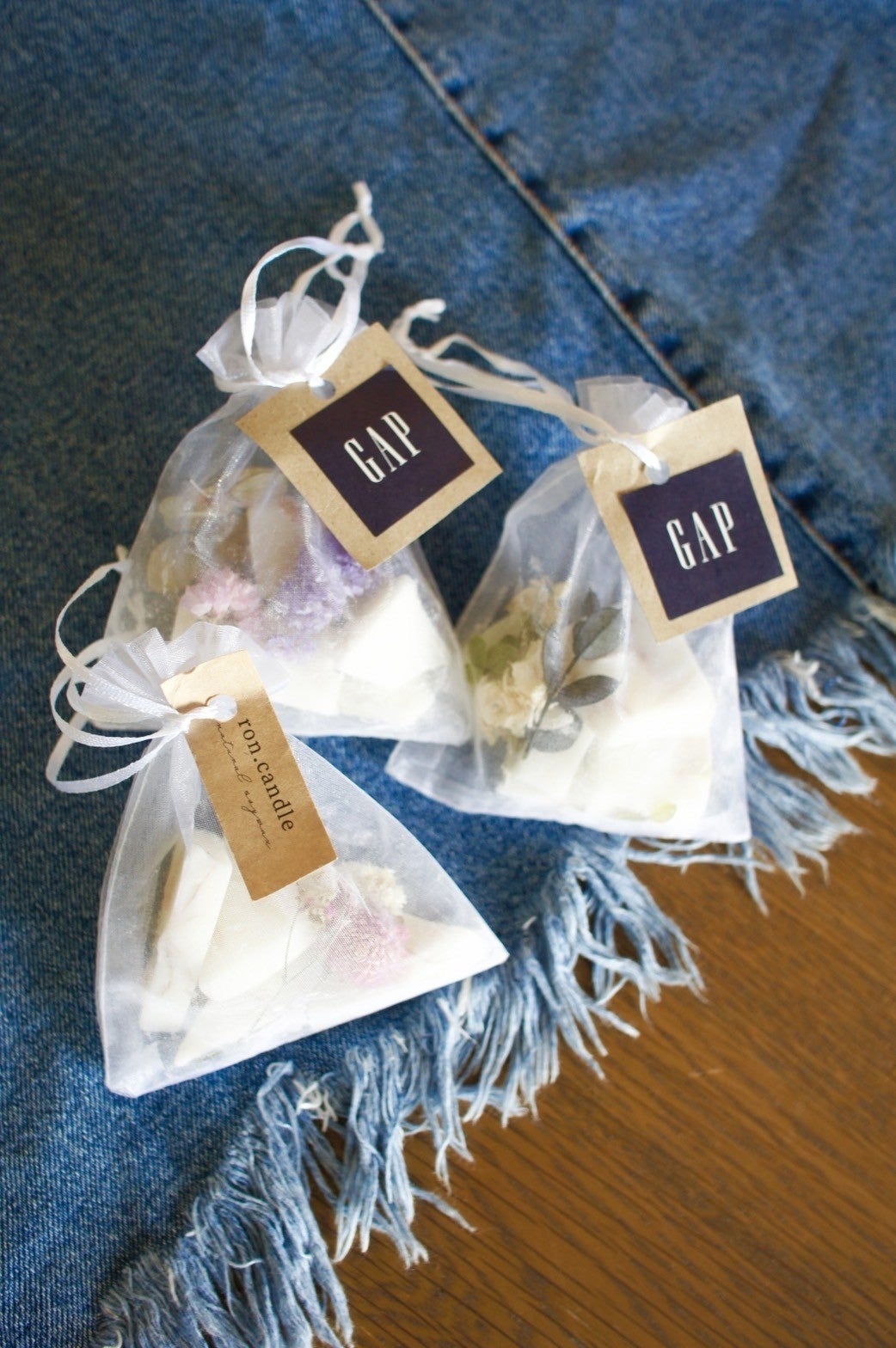 大豆ワックスに植物由来の香りをつけたワックスバーを割ってロスレスフラワーと一緒にポーチに入れオリジナルのサシェを作ります。クローゼットに広がるお気に入りの香りをお楽しみください。