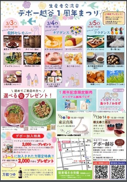 この他にも、 1周年記念のオリジナル保冷バッグを限定販売します。さらに、ご来店プレゼントとして各日先着100名に「遊佐キャラメルおこし」、先着50名に「小島米菓 祝せんべい」、初めてご来店の方にも選べるお試し食材のプレゼントの特典も多数用意してご来店をお待ちしています。
