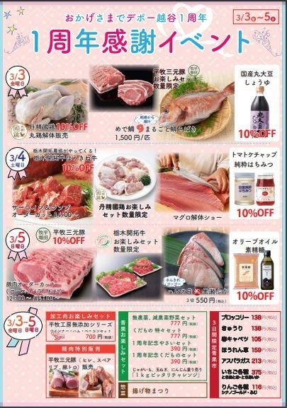 このたび、3月4日(土)にオープンから1周年をむかえるにあたり、3月3日(金)から5日(日)の3日間で記念イベントを開催します。店内では、栃木県開拓農協連による「サーロインステーキカット販売」、「マグロ解体ショー」 や「平田牧場三元豚オーダーカット販売」「丸鶏カット実演販売」「新鮮野菜トクトクセット販売」「パン詰め放題」などを実施します。また、店外の特設ブースでは、お醤油のタイヘイやはちみつのスリーエイト、JA庄内みどりなど生活クラブの提携生産者がイベントに合わせて特別に来場し、試食や試飲を実施、特設ブースを盛り上げます。また地域で活動している「チアダンス」「フラダンス」の発表会、お子さま向けの輪投げ大会など楽しい企画が盛りだくさんです。