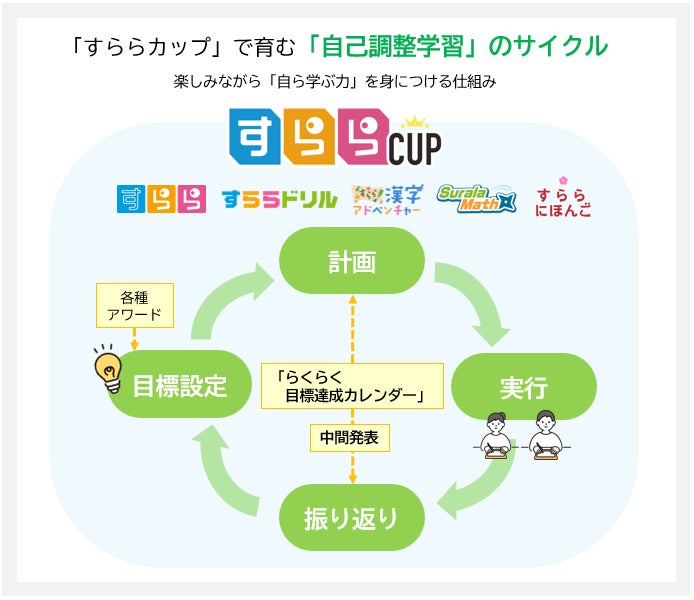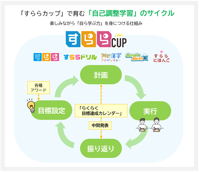 自己調整学習とは、学習者が自らの目標達成に向けて、効果的な学習行動を考え、計画・実行・振り返りを行う学習方法です。「すららカップ」では、子どもたちがこのプロセスを自然に体験できるよう、以下の仕組みを整えています。