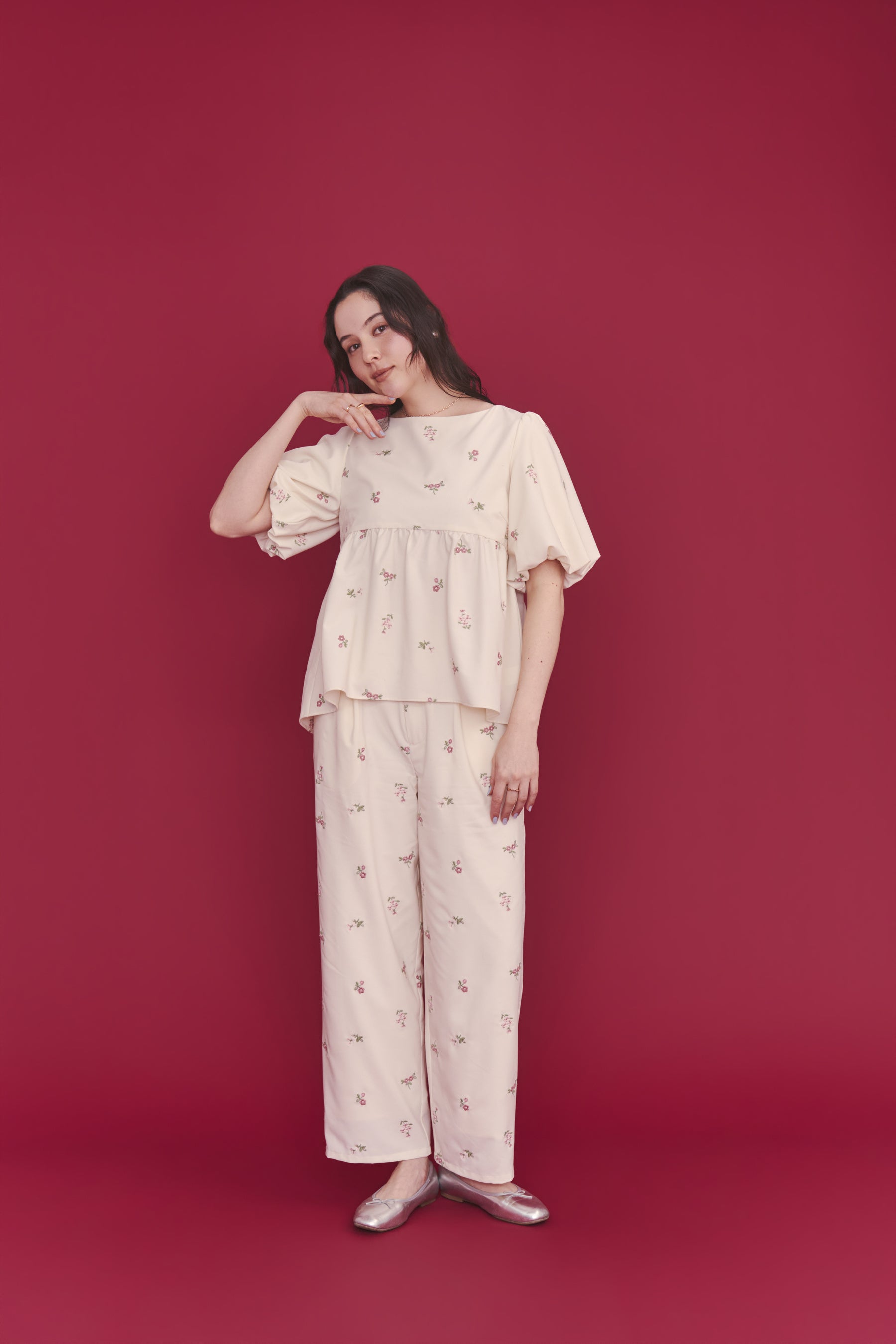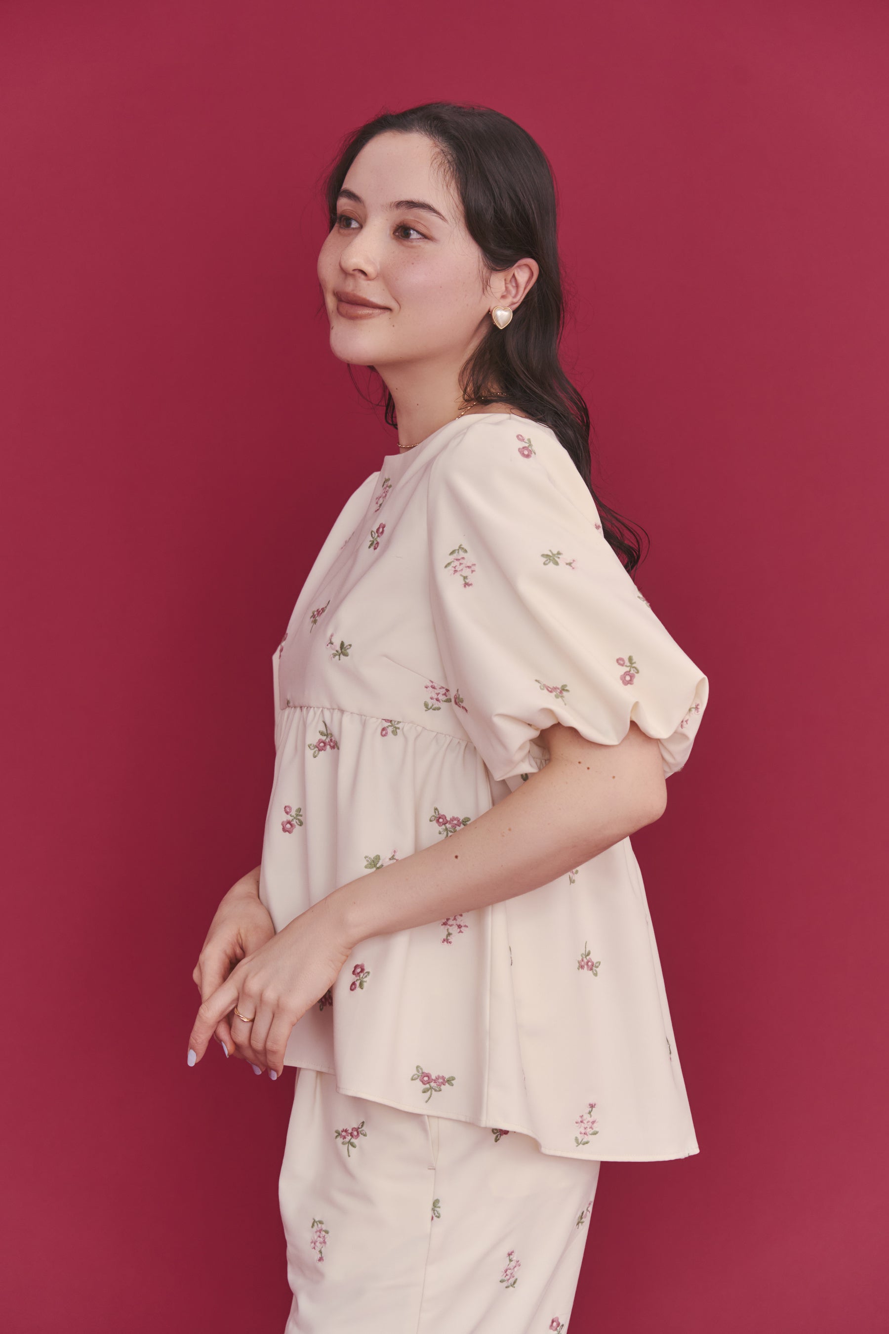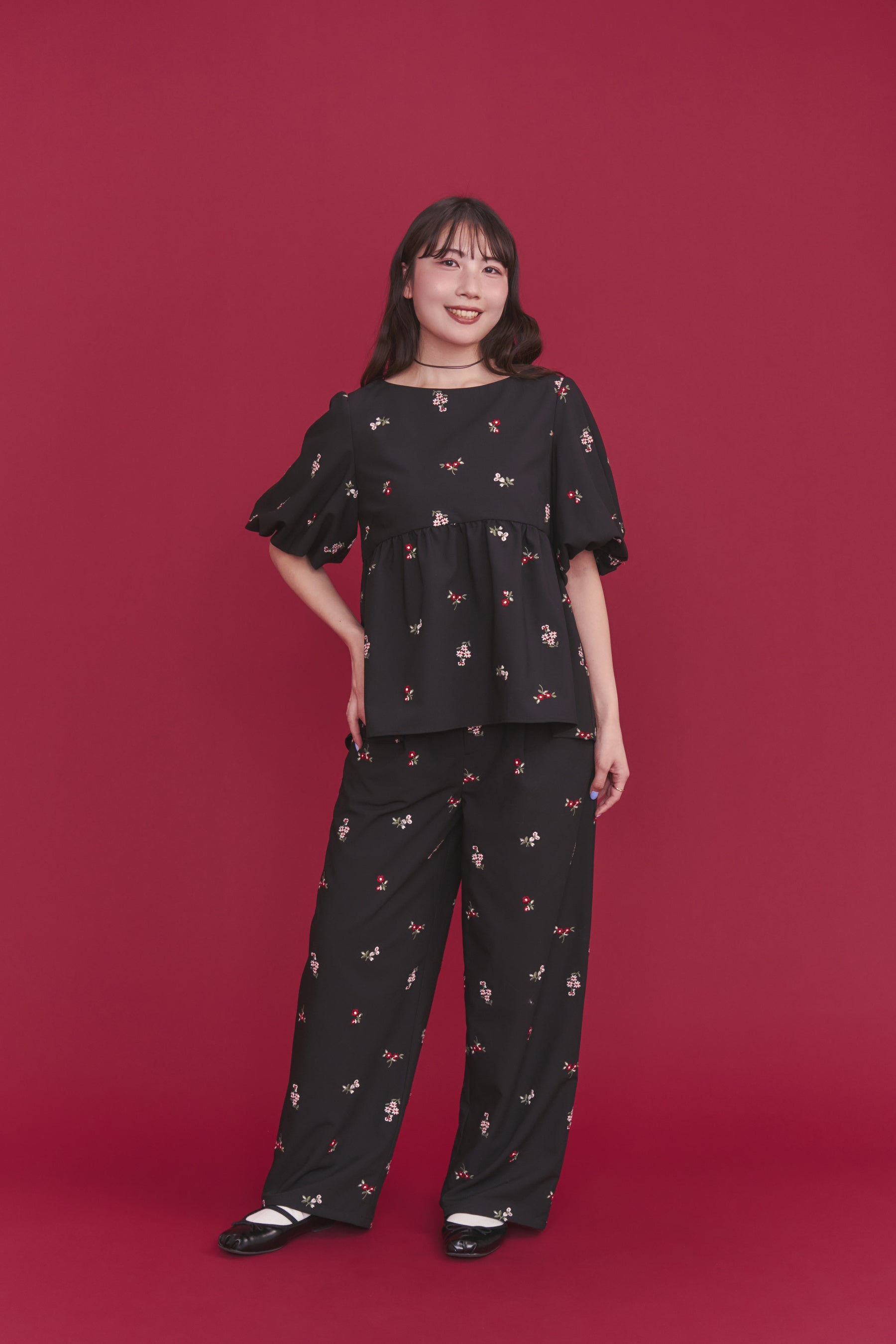 ●繊細な花柄刺繍を施した「総柄刺繍ペプラムトップス Ditsy Floral Embroidery」は2色展開。アイボリーには華やかで大人可愛い配色を、ブラックには鮮やかな色彩が映える洗練された遊び心のある配色に仕上げました。トレンドのペプラムデザインに、デコルテを美しく見せるボートネック、柔らかなパフスリーブを取り入れ、大人が品よく着られるバランスに仕上げることで、オフィスカジュアルから休日のおしゃれまで幅広く活躍します。同素材のストレートパンツとセットアップでの着用も可能。日常をぐっと華やかに彩ってくれる一着です。